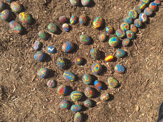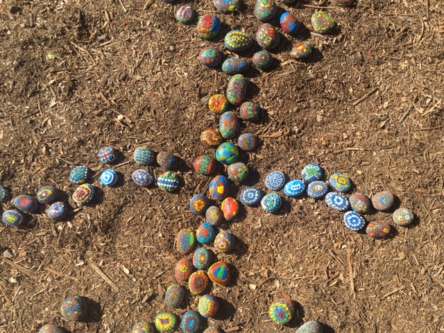 The student and teachers displayed their indigenous art rock projects this morning in the garden outside the library.